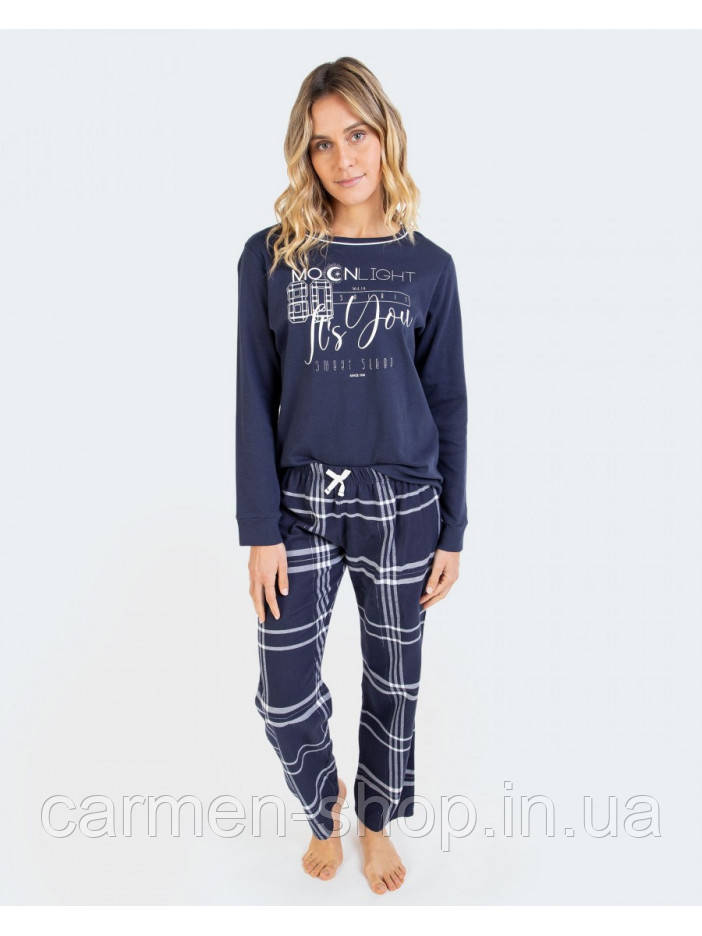Домашній жіночий комплект "Massana" P711219 з бавовняного полотна. Комплект складається з темно-синого кольору з довгим рукавом. Штани в клітку з боковими кишенями.